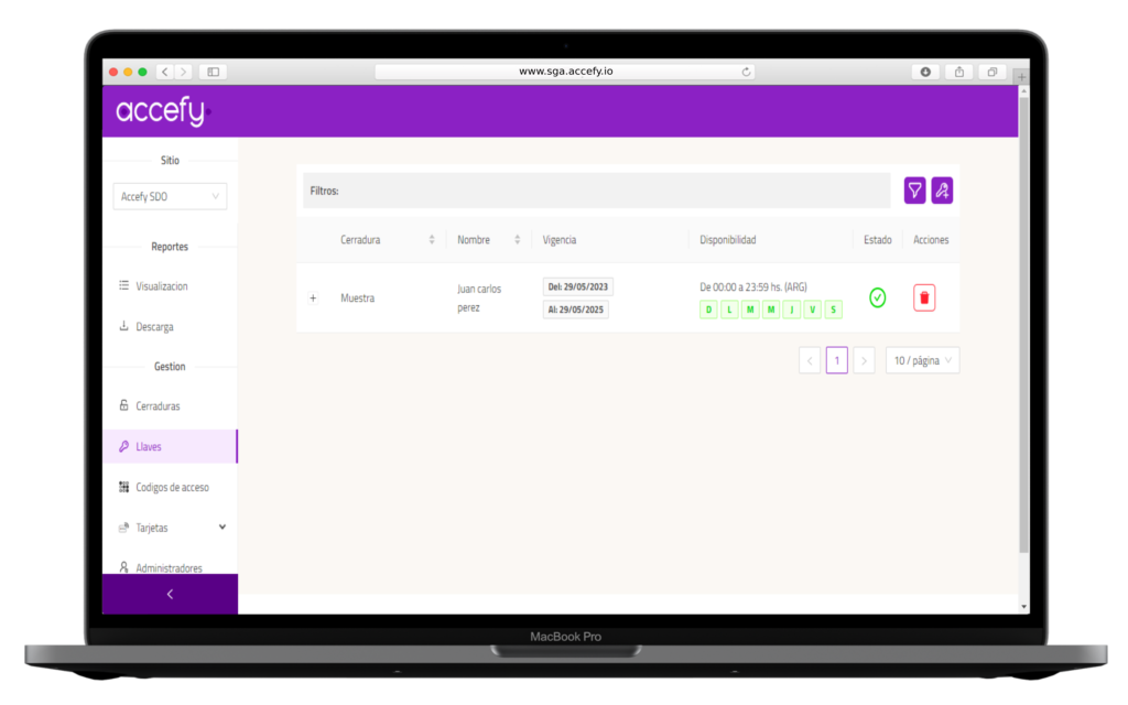 Por último, el apartado de Gestión es de vital importancia, ya que nos permite administrar de manera eficiente el equipo que hemos seleccionado en el apartado Sitio. Desde esta sección, tenemos la capacidad de crear o eliminar llaves, tarjetas, códigos y usuarios con roles de administrador. Esto nos otorga un control total sobre los accesos y brinda flexibilidad para ajustar los permisos según las necesidades de cada individuo o proyecto.
